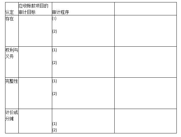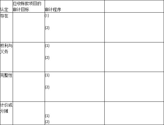 【要求】根据应收账款的认定,填写相应的项目审计目标并针对每个审计目标设计两项简要的审计程序(填入表中)。